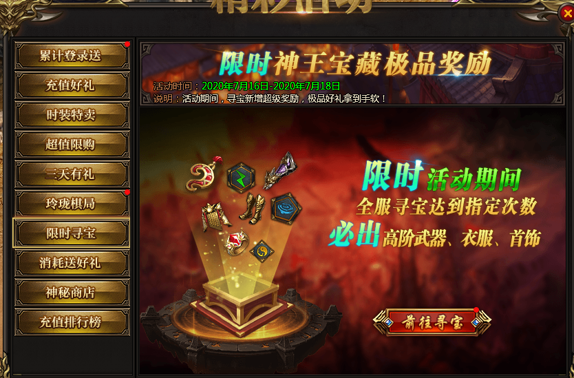 活动说明:神王宝藏限时发放极品装备、神器等,全服寻宝达到一定次数可获得保底奖励