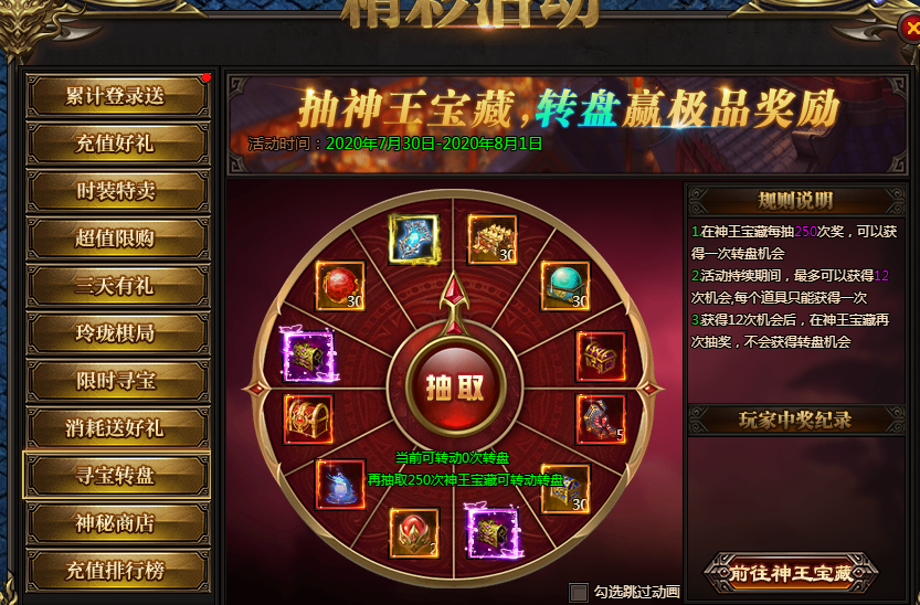 活动说明:每抽取250次神王宝藏可获得转盘机会,转动转盘获得极品保底奖励