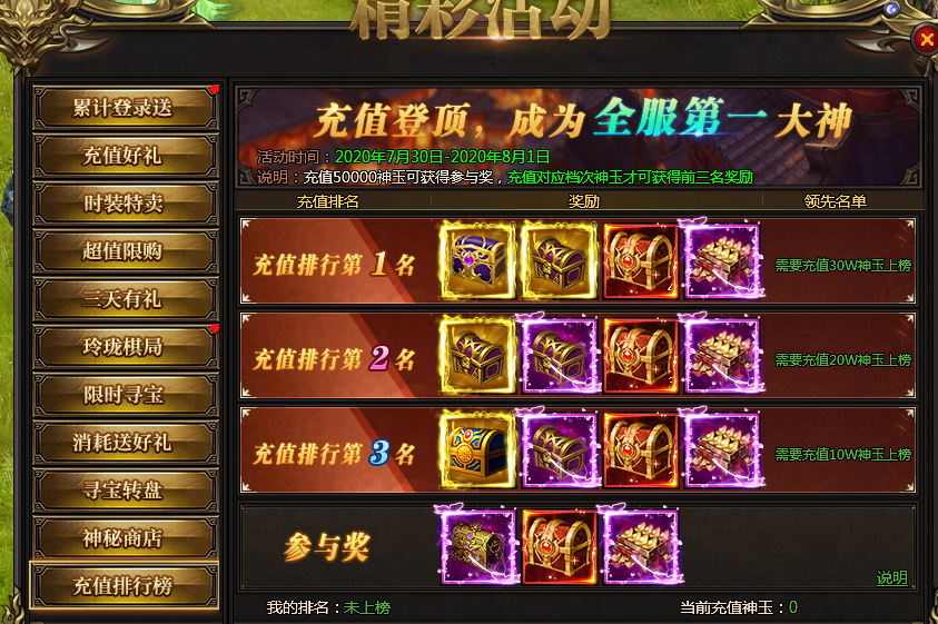 活动说明:名动本服,充值达到100000神玉即可参与排行,前三名均可获得极品自选宝箱。充值达到50000神玉即可获得参与奖。奖励会在活动结束后通过邮件发放