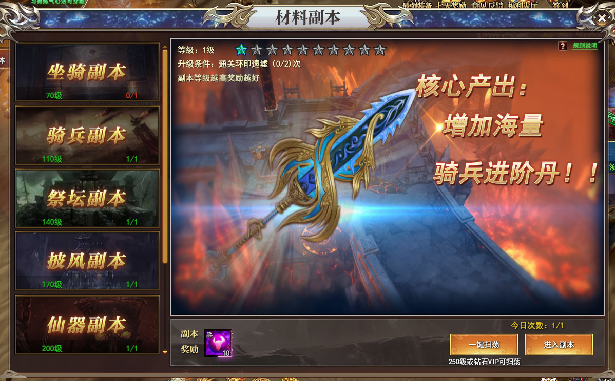 材料副本包括坐骑副本,骑兵副本,祭坛副本,披风副本,仙器副本,魂晶副本,法阵副本等。按照用户角色等级渐次开启。每一个副本都会奖励对应系统的进阶道具。