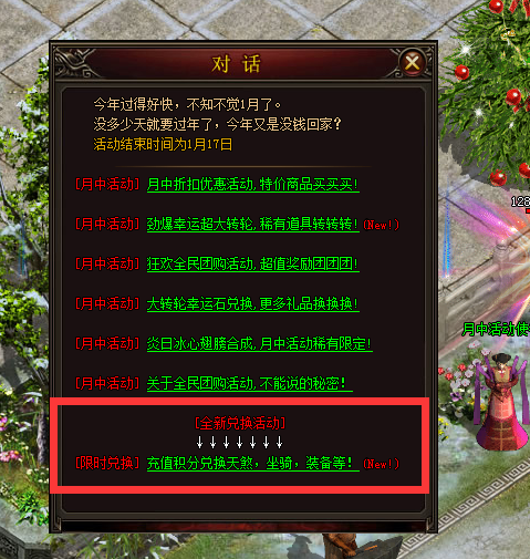 活动内容:月中活动期间,在【月中活动使者】NPC处购买以下物品道具将会有折扣优惠