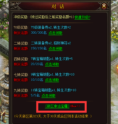 1. 聚宝幸运签----NPC新手冲级奖励 全新的一套抽奖机制 1000元宝一次,每日抽100次可以领取当时高攀十亿经验丹*1及特殊坐骑。抽奖物品表(龙魂"*1,经验仙灯,冰魔心脏,,各种2转装备,小概率3转装备,龙魂"*5.战魂5 法魂5 道魂5 . 灵符5,羽毛5 龙魂"*50.战魂50 法魂50 道魂50 . 灵符50,羽毛50 龙魂"*100.战魂100 法魂100 道魂100 . 灵符100,羽毛100 特别大奖护身戒指 麻痹戒指 复活戒指 )