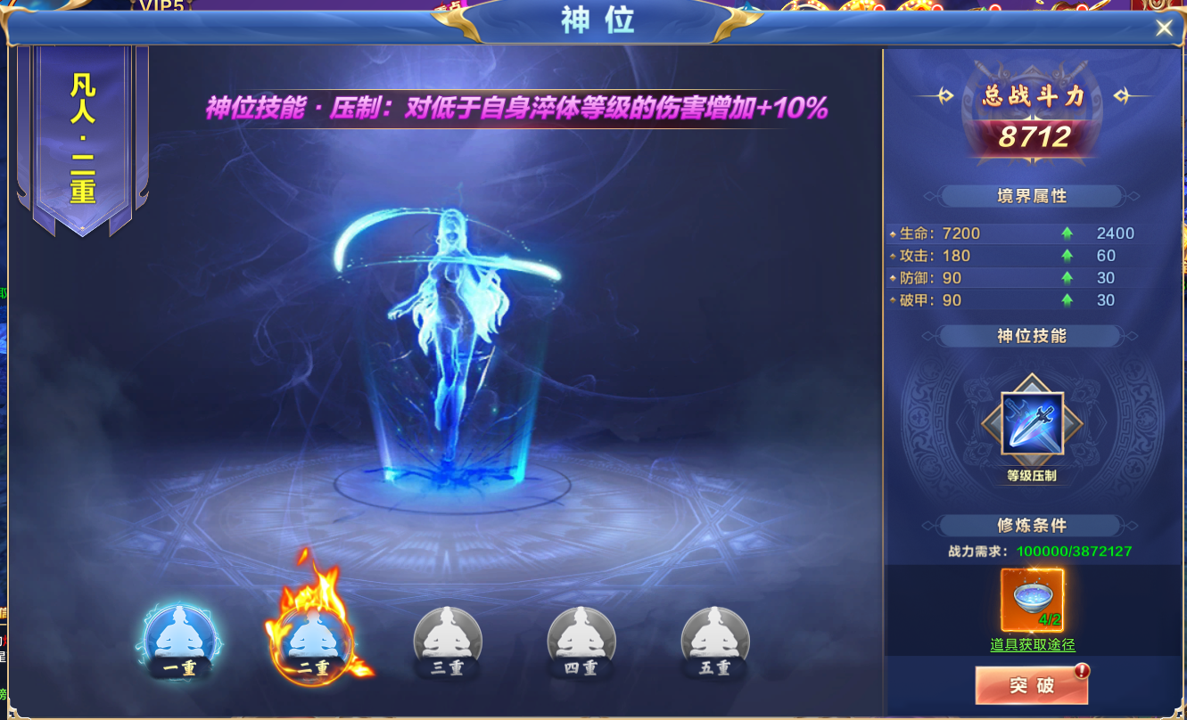 功能激活后,点击界面右下角的“神位”图标,即可进入神位界面,神位等级高的玩家可对等级低的玩家造成压制效果,增加伤害。