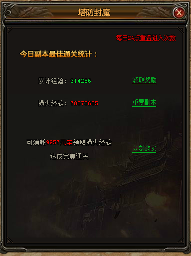 成功完成塔防封魔副本之后,即可在塔防封魔NPC处领取经验奖励。