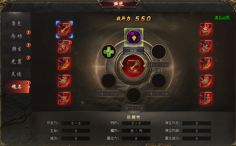 2) 魂石镶嵌后,若满足升级条件,则升级按钮点亮,点击升级直接消耗背包魂石;若需要替换,则直接在背包里选择其他魂石镶嵌即可