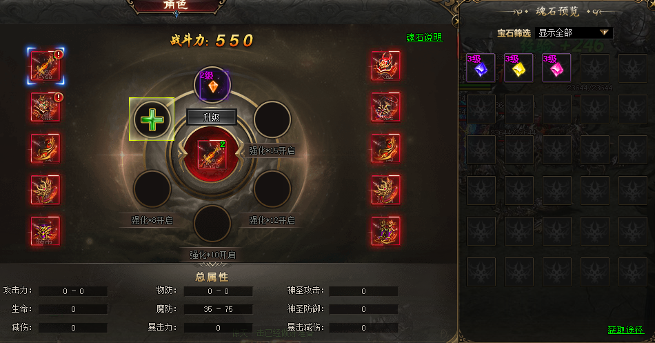 1) 格子开启后,未镶嵌的魂石孔位显示“+”号,点击“+”弹出右边宝石预览弹窗