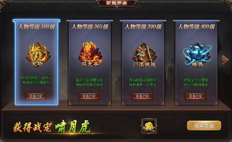 玩家等级达到100级,开启宠物系统并赠送啸月虎,当然,它只是诸多战宠其中之一。