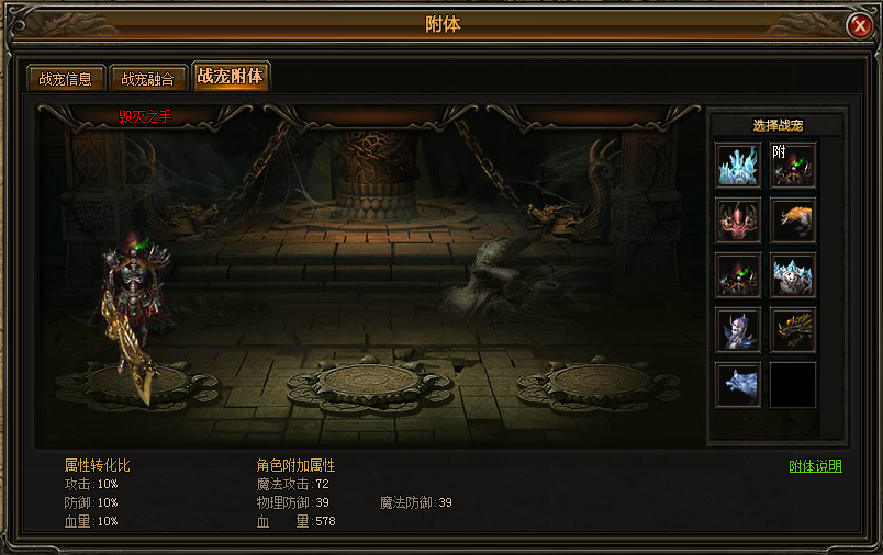 2、 左键点击右侧战宠头像可进行附体,替换前需先解除战宠。