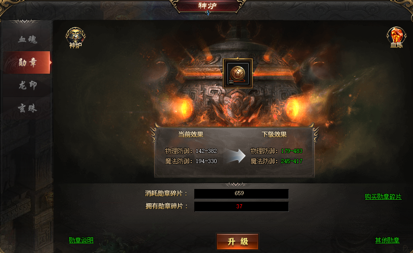 低等级的勋章可通过消耗勋章碎片进行升级,进阶为更高级的勋章,有用高等级勋章,再也不担心被人一刀秒杀了.