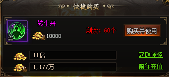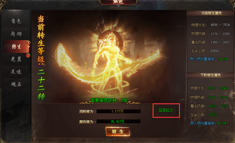 转生等级提升需要消耗转生修为,可以通过活动、礼包、商城等得到的转生丹来获取修为