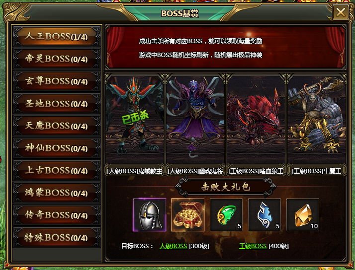 击杀对应条件的BOSS,完成对应条件,即可领取豪礼
