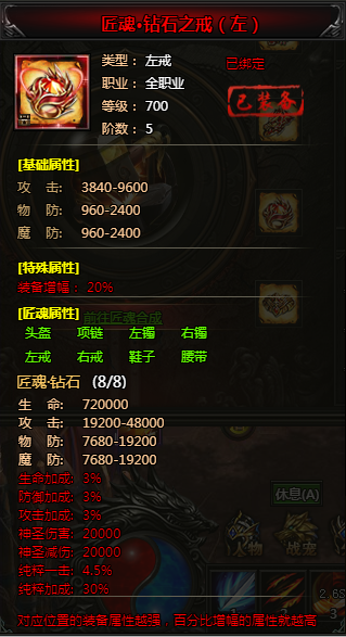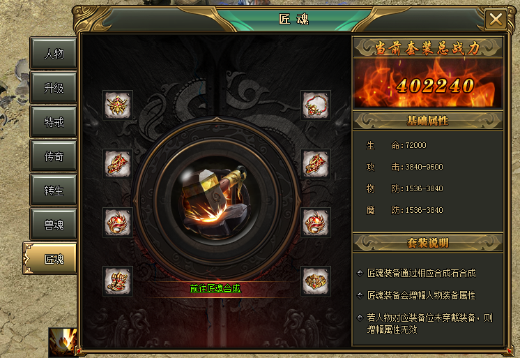 穿戴完整匠魂装备可获得匠魂装备套装效果,获得额外属性提升。