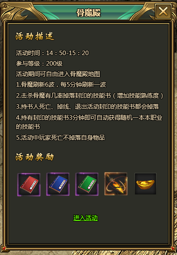 击杀骨魔有几率掉落封印的技能书(增加技能熟练度),持书人死亡、掉线、退出活动封印的技能书都会掉落,持有封印的技能书3分钟即可自动获得随机一本本职业的技能书,活动中玩家死亡不掉落自身物品。