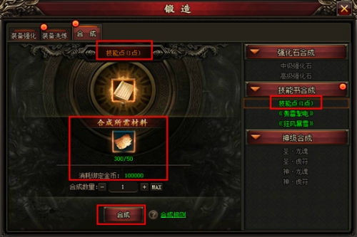 合成分为三类:强化石合成、技能书合成、神级合成。