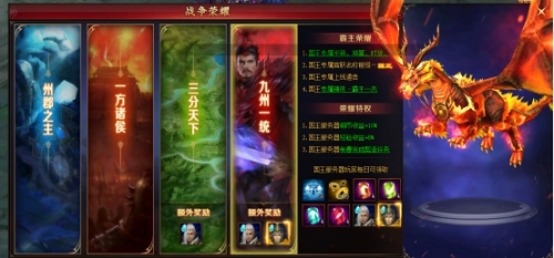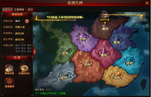 征战九州是以跨服战对抗为主的一个玩法集合——活动包括了“州牧争夺战”、“跨服诸侯战”、“跨服三公战”、“跨服国王战”以及“跨服乱斗战”,总共5大活动。