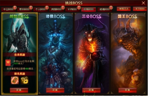 从主界面的【召唤boss】图标,可以转到该界面。获得相关霸主权限的帮派帮主可以选择召唤一个“霸主BOSS”,供服务器所有人员挑战。挑战成功后每个参与者都有机会获得分红奖励。