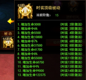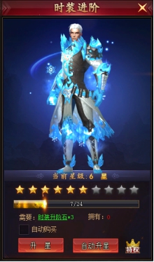 升阶消耗时装升阶石,每次升阶可获得一定范围内的成长值,成长值满时可点亮一颗星。在三阶之前点亮十颗星可直接升到下一阶,三阶开始点亮十颗星后还需要使用时装转盘钥匙进行突破,突破成功后时装才会升至下一阶。