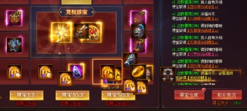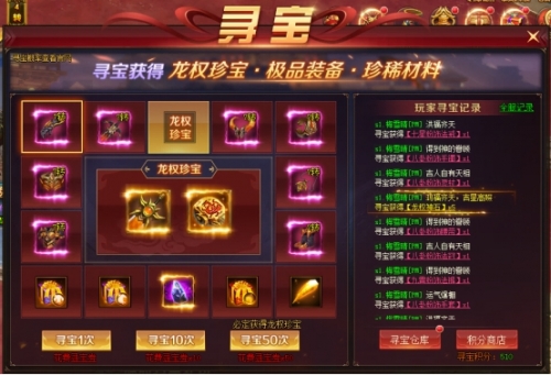 3. 消耗寻宝卷即可进行寻宝,参与寻宝将获得大量装备、材料,更有稀世珍宝等着你。一次性寻宝50次 ,还会必定获得稀有的龙权珍宝。