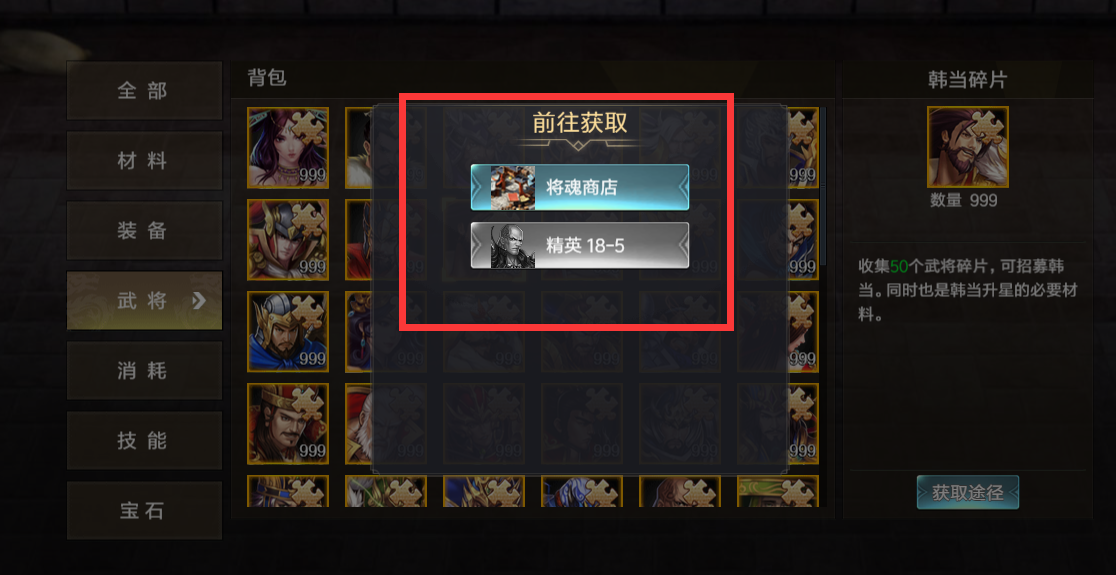 (3)武将碎片可以点击跳转到获取途径