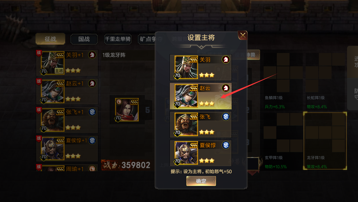 点击“设置主将”按钮弹出设置主将页面,主将初始怒气会增加50