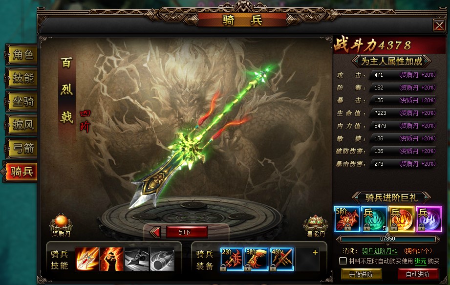3、骑兵装备主要通过怪物攻城获得。