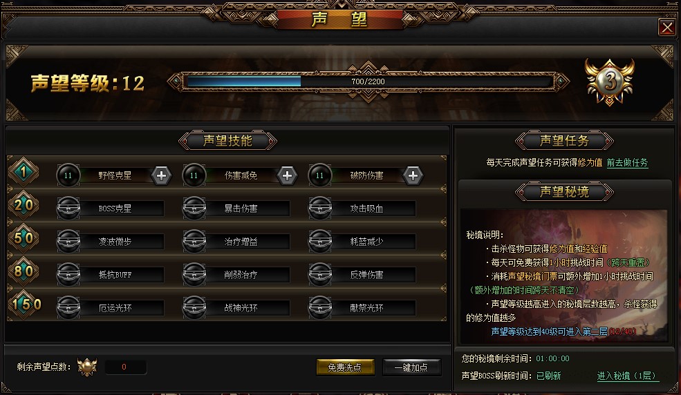 每次升级声望等级,都将会获得声望技能点,可以分配技能点学习对应的声望技能。在不同情况下学习声望技能,将会发挥出更好的状态。