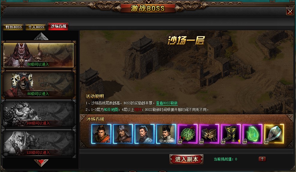沙场百战中挑战值消耗完之后击杀BOSS不在获得任何奖励,可以等到第二天恢复。