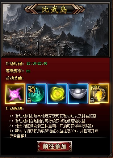 比武岛中不仅可以泡点,也可以采集宝箱。其中比武岛中勇者宝箱的奖励最好,只有占领据点旗子的帮会成员可以采集。