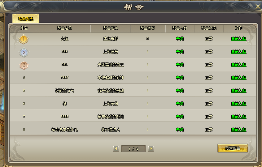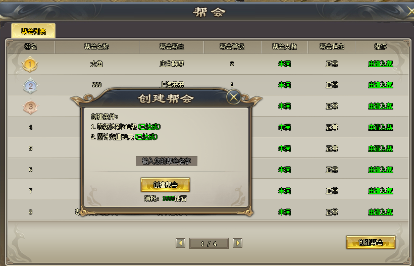 角色等级达到200级,就可以创建或加入一个帮会,与众多好友一起打怪爆装,征战沙城了!