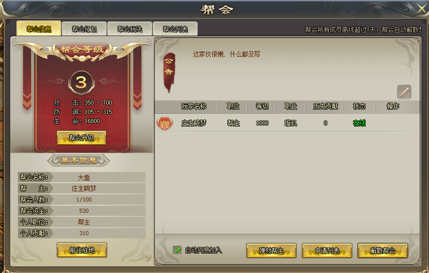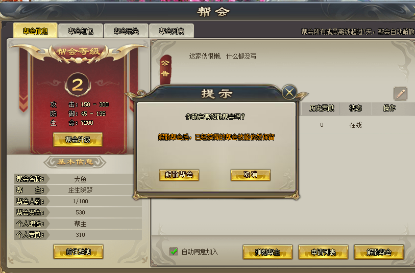 帮主、副帮主可以发布招收成员公告、处理入帮申请、踢出帮会成员;帮主还可以解散帮会;其他帮会成员可以查看本帮会信息,弹劾帮主。