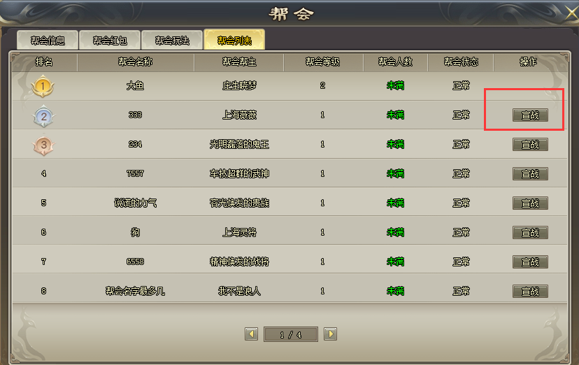帮主或副帮主可在帮会列表中选择其他帮会进行宣战,宣战持续24小时,在此期间双方帮会成员PK不增加PK值,不掉落幸运值。