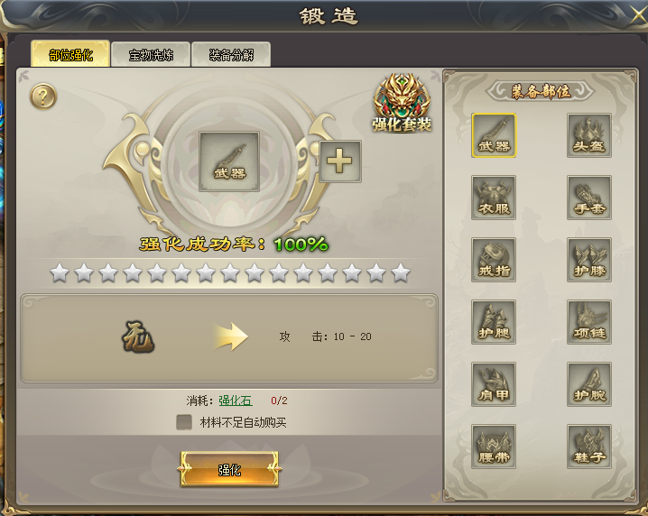 强化的对象为装备部位,强化可提升装备部位属性,提升效果仅与装备部位相关,更换装备后强化属性不改变(图1)