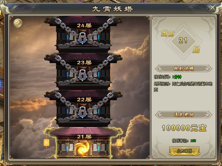 角色达到100级后,通过九霄妖塔图标按钮可进入九霄妖塔。