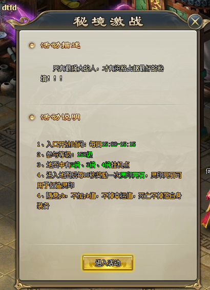 活动时间:每日14:35开放秘境,尽情pk不加pk值,不掉幸运值。