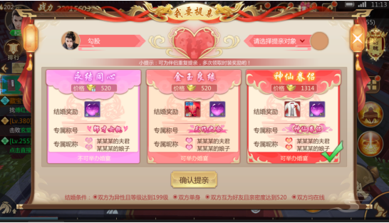 结婚有三个档次可以选择,档次越高奖励越高。完成三档结婚还能获得一个珍稀称号。