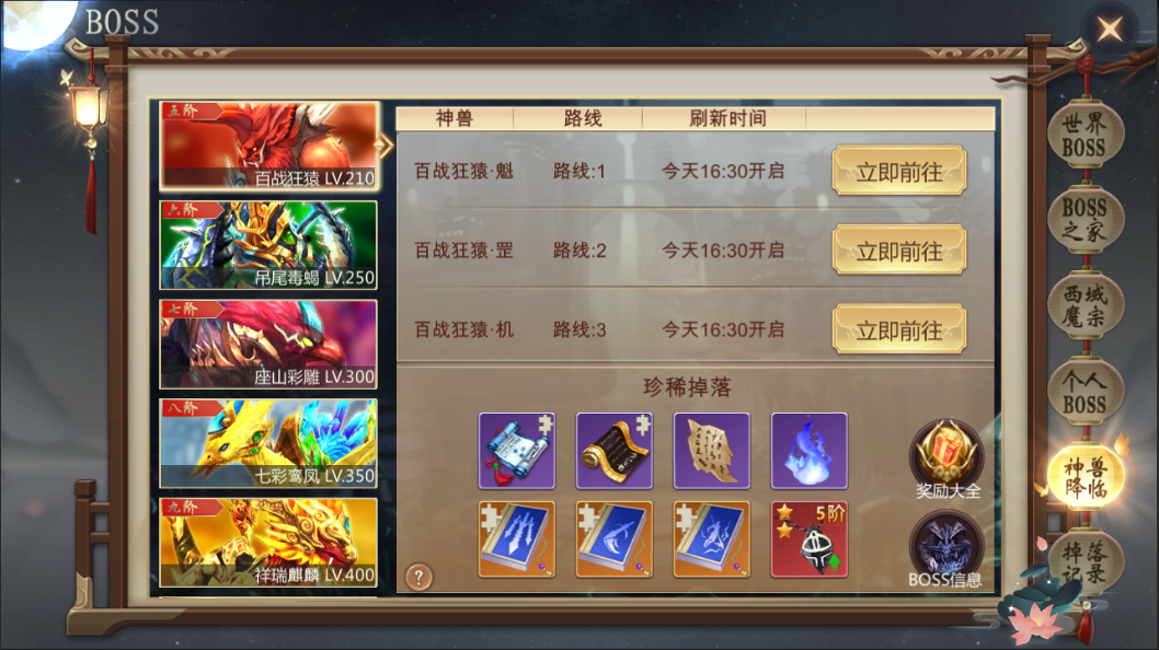 2. 神兽降临奖励通过伤害排名发送排名奖励(1-10名)、摇骰子决定护盾奖励、击杀boss者获得击杀奖励。伤害排名第一的可获得帮派红包(必须加入帮派)