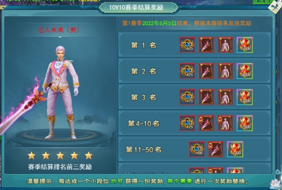 赛季排名结算奖励,一个赛季结束后,根据本服10v10排名榜发放赛季结束奖励:稀有时装,龙晶,修真材料,荣耀店,竞技装备等奖励。