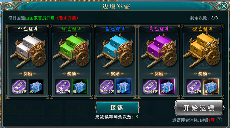 军需玩法分为三部分内容,接镖、运镖和劫镖