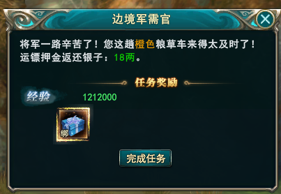 1、在军需大臣处点击军需便可以开始接镖了,你可以接取普通镖车,也可以消耗无敌镖车令接取无法被击毁的无敌镖车,成功接取镖车需要上交一定的银两作为押金,如果在运镖结束时镖车没有被击毁,押金会返还,反之不会返还押金