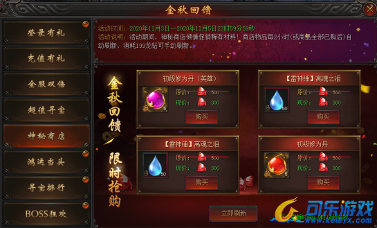 活动说明 : 活动期间,神秘商店倾情促销稀有材料!商店物品每2小时自动刷新(或全商品全部已购后),消耗199龙钻可手动刷新。